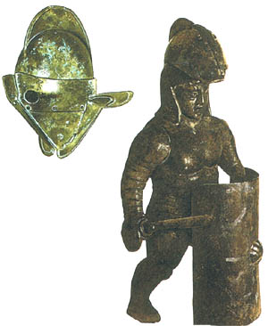 萨姆耐特:最初的萨姆耐特角斗士是轻装,然后装备越来越重。带面罩、羽毛的头盔,左脚有高过膝盖的护胫甲,与军团士兵同样的塔盾和短剑。