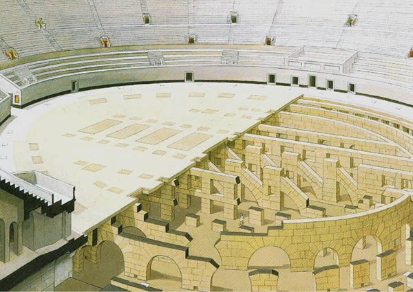 大竞技场为椭圆形,188 X 156米,高45米,地基是厚12米的混凝土,地基上的80根石灰岩承重墩构成主体框架。墙的建材是混凝土外砌方砖或火山浮岩。