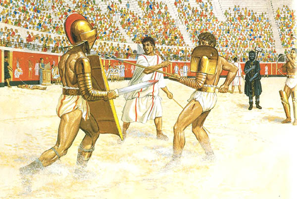 根据庞贝城壁画复原的角斗场景,剑士与网民正在搏斗,网民的网已撒出,但显然没有效果,他配有肩盾作为没有头盔的补偿。一旁是裁判拿着棍子,场地边是伴奏的管风琴乐队,后面的黑衣人是一个政府官员,打扮成Charon(罗马神话中冥界渡口的船夫),他负责用烙铁确认角斗士是否真的死了。然后尸体就从左边的小门拖走,地上的血迹则用沙子盖上。