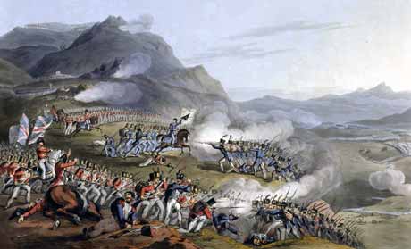 1808年3月,以保护西班牙领土和解决王室矛盾为名,一支10万人的法军部队进入西班牙。缪拉元帅占领马德里。西班牙王室畏惧皇帝的实力,因而承认皇帝的哥哥约瑟夫为西班牙国王。5月2号,马德里发生暴动,接着全国人民都反抗法国人。法国部队极为分散,英国又不停以物资支持西班牙人和葡萄牙人的反法运动。在贝伦(BAYLEN),被包围的法国士兵向西班牙游击队投降。号称从无败绩的法国军队败在了一支非正规军手里,欧洲一片哗然。英国人看准了时机,8月1日,在蒙迭戈河的入海口,一支17000人的英军登上了葡萄牙,指挥官就是阿瑟。维尔斯利,也就是后来的威灵顿公爵,从他踏上这快土地起,他从未败过一次。此时,号称“风暴”的朱诺率精锐法军杀入葡萄牙。在8月17日的罗里卡,英法两军第一次在半岛上交手。法军指挥官是朱诺部将德拉波尔得。他谨慎的将法军布置在一快战略性很强的高地对抗英军。威灵顿采取了中路牵制,两边包抄的传统战术。英军中路军官库克不听号令,在成功抵御法军攻击后贸然反击,不仅中路大伤元气,他本人也被流弹击中而死。一时间,英军中路大乱。阿瑟。维尔斯利并没有因此而手忙脚乱。他先冷静的稳住阵脚,沉着指挥,当两路已经迂回成功时,他下令三路进攻,法军大败。8月21日,威灵顿遇上了法军名将朱诺,两军在维梅罗附近展开激战。朱诺进犯葡萄牙总兵力为26000人,威灵顿只有17000人,法军还是占优。法军的火炮和骑兵都占绝对优势。纵队密集进攻,大炮成群轰击,骑兵冲跨对方阵型都是法军的战术传统,也是皇帝能够在欧洲很多大战中取胜的法宝。可是朱诺怎么也没想到,他遇到了一个指挥能力比他高一截的对手。为了防御大炮群的轰击,为了减少伤亡,威灵顿习惯布兵于山的反面,或是洼地,这就是有名的后坡战术。为了发扬最大火力,威灵顿有创造出呢称为“细红线”的步兵阵型,500人在150米一分钟内可以射1000到1500枚子弹。还有散兵的干扰,士气打击和冷枪。由于英军的布朗贝斯火枪略优于法军的1777步枪,再加上专门给优秀射手配备的贝克枪,英国步兵在战术发挥上优于法军。这些前所未有的新战术让法国步兵目瞪口呆。他们先以纵队前进,忽然背后山坡出了一队英军。法军在对面用特有的张牙舞爪的“战术”前进,一般欧洲其他国家的士兵也会相应对冲。但英军两排步兵似乎不为所动,静静的等待。法军有些人边走边乱射,英军仍然不动。这种过于镇静的表现令法军感到奇怪。接着,法军开始冲锋。所有人口中大喊:“皇帝万岁!上刺刀!冲锋!”,一边往前小跑。一些人干脆边跑边开枪。到了300米,英军仍然不动,就像一堵红墙。法军在冲锋中阵型已经不能维持了,大家都希望冲上去肉搏。英军开始准备,等敌人到了跟前,忽然一起射击。弹雨如飞蝗一般,法军一排一排倒下,全部乱了阵脚,开始往回逃。后面的部队上来增援,逃兵重新排好阵势,掉头前进,他们发现英军又排回原来的阵型,似乎什么都没发生过一样,只是脚下很多法军士兵的尸体。最终威灵顿取得了胜利,朱诺向英军投降,法军剩余部队返回了法国。由于协定牵了太“平等”,英国怀疑威灵顿有意放法军,所以把他召回国内。