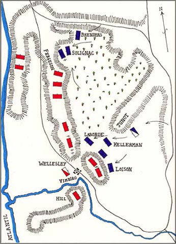 维梅罗战役地图,韦尔斯利(既威灵顿)占的地势基本无法被迂回,蓝色为法军,带对角线的矩形代表骑兵部队