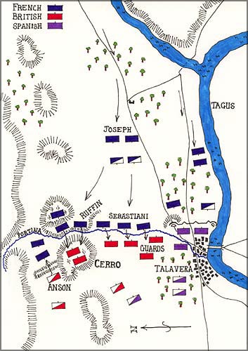 塔腊维拉战役地图,英军布阵无懈可击,左翼步兵两队防守山头,法军主动下山出击,安森的骑兵在谷地实施机动,中部布置重兵,右翼的西班牙军在森林掩护下战斗。