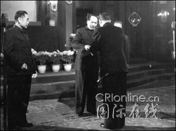苏联首任驻华大使罗申(背对者)向毛主席递交国书