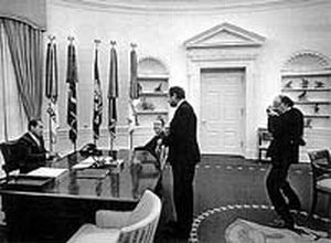 1972年6月17日,以美国共和党总统尼克松争取连任委员会首席安全顾问詹姆斯·麦科德为首的5人闯入华盛顿水门大厦民主党全国总部办公室进行*活动,当场被警方逮捕。结果证明他们是为共和党争取总统连任委员会工作的。听到这个消息,尼克松下令掩盖事实。在幕后一方面设法让联邦调查局停止调查此事,一方面贿赂被捕者,要他们服罪并保持沉默,从而把这件事的真相暂时掩盖起来。11月7日,尼克松在竞选连任中获得了压倒性胜利。