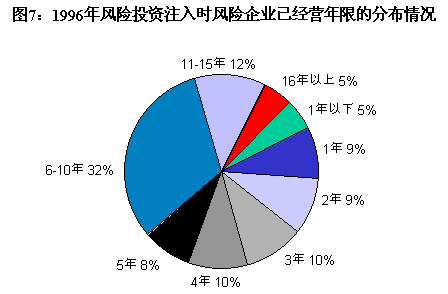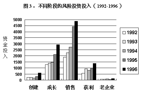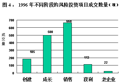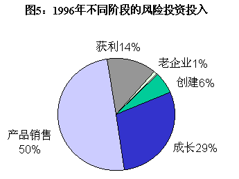 美国风险投资协会(NVCA)的统计表明,风险投资主要集中新创企业的在成长阶段和销售阶段,约 有80%的风险投资资金投在这两个阶段,仅有4%左右投在创建阶段,另有14%左右投资于开始获利阶段。有 关情况见表1和图3、图4、图5。