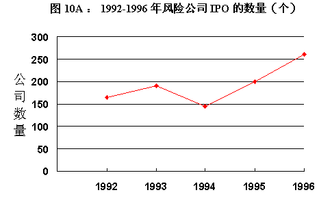 虽然1996年整个美国股市表现旺盛,但1996年新上市的风险企业却没有上佳表 现。1996年年底的价格与IPO时的价格相比,平均仅增加了13%,只有17个公司的增长 超过100%。