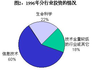 就整个行业而言,生命科学领域的成交量有所萎缩,对于这一领域的投资占全部风险投资的比例 从1992年的35%下降到了1996年的22%,这是因为这一领域的技术发展没有信息技术领域那样活跃,由 此可以看出风险投资与科学技术发展相关密切。1996年风险投资分行业的情况见图2。