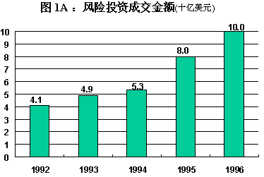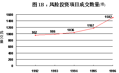 美国风险投资协会(NVCA)的研究表明,进入九十年代,风险企业的数量不断持续上升,投资规 模也在不断增加。1996年实际成交了1500多项投资,涉及资金100亿美元。截止到1996年底,在美国境内 尚有风险投资支持的3000多家公司依然由个人持有。美国1992年至1996年风险投资的成交金额和成交量, 见图1A和图1B。