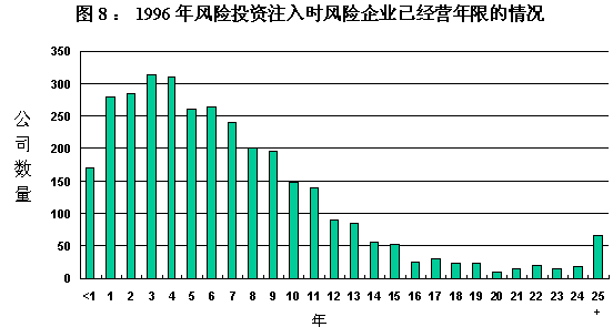 一份对五百家由风险资金支持而发展起来的企业的调查表明,1991年至1995年间,这些企业提供 的就业机会以每年34%的速度增长,与此同时,美国幸福500家(Fortune 500)公司每年以4%的速度在 减少工作职位。而且,受风险资本支持的公司创造工作机会的速度高于一般同类企业(trendsetters), 在另外一份调查中,受风险资本支持而发展起来的企业平均雇佣114名职工,而同类一般企业平均只有 60名雇员。