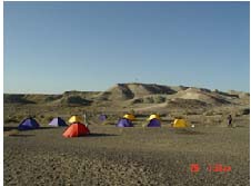 初来马鬃山,领教了这里的太阳,加上时值盛夏,所以与灼热的太阳时刻交锋。这里的太阳不仅照射、穿透能力强;而且日照时间还长。从早晨的6点开始,红日初升,空气中异常洁净,没有丝毫遮拦,生怕照不到哪个角落,一直持续到下午7点方才缓和下来。由于这里干旱缺雨,加上地面植被稀少,所以,太阳毫不吝啬地亲吻这这片土地和生活在这里的人们,人们成为太阳能的唯一吸收利用者,太阳也成为人们的无奈。特别是在野外宿营帐篷里,像一个蒸笼蒸烤着人们,此时,每个队员的心中唯一祈祷的是一片乌云能够蔽日。
