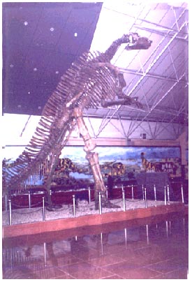 中加马门溪龙:虽现在还没有装架展示,但仅从发现的股骨(大腿骨)足以猜想它活着时的身体有多长,这根股骨长约2.5米,估计复原后体长可达35米,产地是新疆准噶尔。因为它是在中国和加拿大联合考察时发现挖掘出来的,所以叫中加马门溪龙。