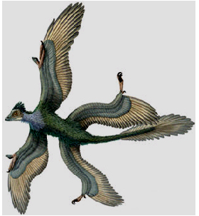 > “顾氏小盗龙”正在撕开层层轻纱遮掩着的迷雾露出事情的真相。顾氏小盗龙全长大约77厘米,它的爪子尖锐弯曲、尾巴比身体长。除了前肢较短外,别的特征都表明了顾氏小盗龙的飞行能力较始祖鸟还要强:前肢的结构比始祖鸟更加接近现代鸟类;发育有较大的胸骨和七对较为进步鸟类才有的钩状突。新发现的“顾氏小盗龙”生活在距今1.2亿年的自垩纪早期。这种恐龙浑身披着羽毛,最为奇特的是,它不仅前肢进化成长着羽毛的翅膀,后肢也同样如此,即长着四只翅膀。科学家称,这种集四个“翼”为一身的形态在其它脊椎动物中至今还没有发现过。科学家们还推测,恐龙的后肢翅膀可能是在飞行过程中起到平衡作用,这对于早期涉足飞行是非常重要的。