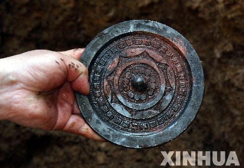 4月23日拍摄的在江苏省东海县一古墓中出土的铜镜。近日,考古人员对江苏省东海县尹湾村的一座古代墓葬进行了抢救性发掘,出土了铜镜、玉器、古钱币等文物。这座墓葬深7米,东西走向,为西汉时期夫妻两棺合葬墓。