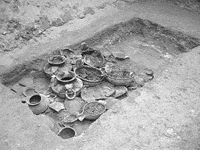 姑子坪墓地位于山东沂源县城西北约1公里处的螳螂河西侧与其支流梨行河交汇处的高台地上,南侧与姑子坪遗址相邻。早年发现,面积约2万平方米。去年6月,在青岛至莱芜高速公路沂源下道口段工程建设中,山东省文物考古研究所、淄博市文物局、沂源县文管所联合对工程占压地段进行了钻探及抢救性发掘,历时2个月。共清理墓葬40座,其中周代墓葬28座,汉代墓葬12座。出土了一
