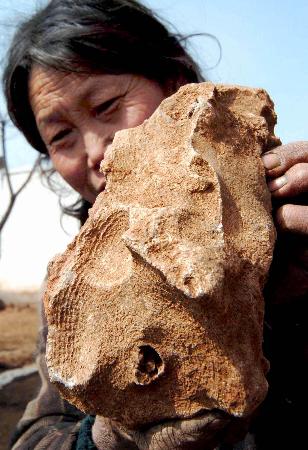 3月9日上午,一位村民在展示她从地里捡回的一块骨骼化石。