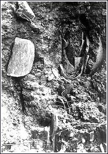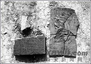 石门关南峰宫殿遗址断面上相互叠压的筒瓦。