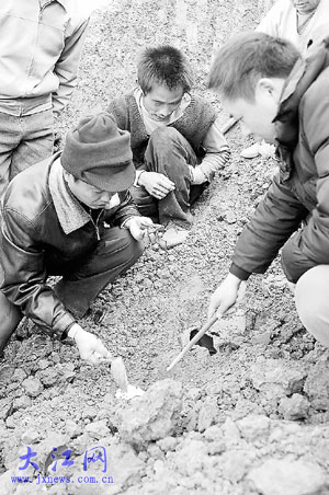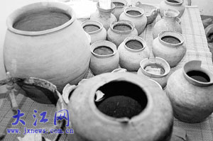 这两座汉墓位于大余县池江镇长江村寨上小组的狮形山,是在前几天高速公路工程队施工时意外发现的。据省考古研究所副所长徐长青介绍,这是西汉时期搭建在山上的两座土坑、竖穴墓,由于植被较好,在文物调查时未被发现,其中一座宽3米、深4米,另一座深3米左右,由于公路施工造成的部分损坏,两墓的长度目前无法确定。这两座墓的墓壁都加工得非常精细,从风格上来看,属于典型的西汉时期流行于中原地区的墓型。出土的印纹硬陶更能证明此墓建于西汉时期,墓的规模在省内较罕见。专家在两座墓中发掘的铜器有盆、罐、釜、剑、