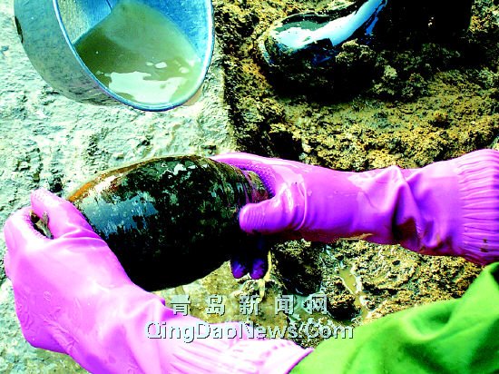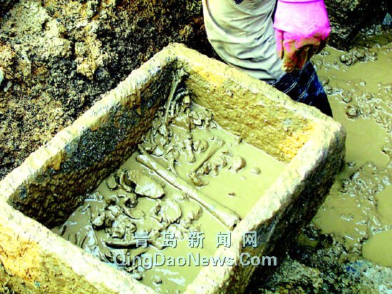 昨日上午11时许,记者在胶州寺门首路建设中的阜安公寓施工现场看到,3名文物工作者正在对一个用青砖垒成的拱形砖洞的四周进行清理。“仔细点,这是个古墓。”文物工作者逐步对砖洞进行清理,意外地在洞口处发现了一根尸骨。由于洞内积水较多,工作人员调来一个抽水机往外排水,不久,洞口处一个长方形的石槽显现了出来。