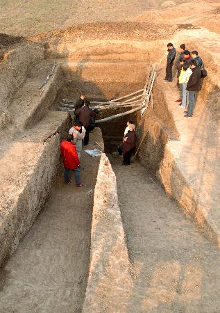 12月7日,考古人员在湖北襄樊勘查发掘出的双墓道西汉墓葬。今年6月以来,湖北省襄樊市考古队对襄樊老河口市仙人渡镇柴店岗村九里山墓地进行了保护性发掘,共勘探出两汉墓葬230座。截至7日,考古人员已发掘了其中的102座墓葬,发现西汉双墓道夫妻同室合葬墓3座。据考古专家介绍,目前发现的这3座双墓道西汉墓葬的双墓道是两次下葬形成的。