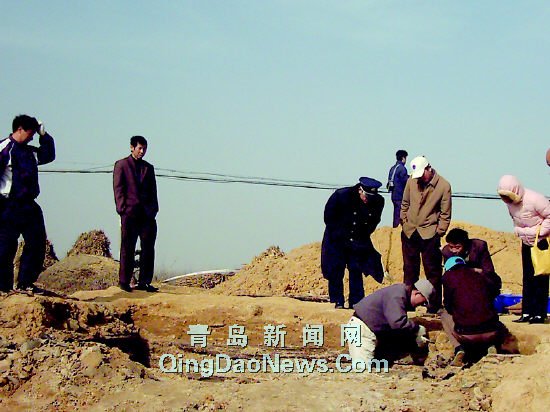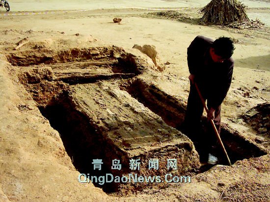 “胶南海青镇敖上村西发现一座古墓,里面有一口完整的棺木,昨天还挖出了周朝的陶罐。”昨天上午,记者接胶南市民王先生的报料后立即赶赴现场。