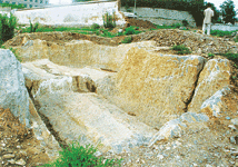石渣坑1处。位于IV4区东部,无开凿痕迹,底部为-石砾层,为自然石坑,南北长6.1、东西宽5.2、深2.3米,内填满碎石,推测此处为专门堆放周围采石坑内开凿出碎石的坑。