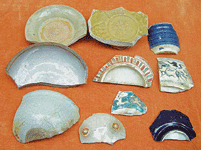 经过初步整理,此次出土的大量瓷器(片),按时代可分为宋代、元代瓷器(片)和明代瓷器(片),以明代早中期景德镇青花瓷器(片)为大宗。绝大部分是民窑产品,仅有个别出自官窑。普遍带有摩擦、磕碰、锔补等使用痕迹。宋代瓷器(片)极少,为钧窑系、定窑系产品。元代瓷器(片)的窑口有景德镇窑系、龙泉窑系、钧窑系、磁州窑系、枢府窑等。品种有白瓷、青瓷、黑瓷、龙泉釉、白地釉下黑彩、白地釉下酱彩、白地釉下黑彩划花、枢府釉等,还有极少量的青花。器型有各类碗、盘、杯、炉、碟、罐、壶、瓶、洗、筒以及少量瓷塑,并发现有较为罕见的白瓦。主体纹饰有花草、人物、动物等题材,辅助纹饰有变体莲瓣纹、卷草纹、云纹、蕉叶纹等,部分龙泉窑瓷器(片)上压印有文字。明代瓷器(片)绝大部分属于明代早中期景德镇民窑烧造的青花产品,官窑的很少。窑口有景德镇窑系、龙泉窑系、磁州窑系、玉溪窑等。品种繁多,有青花、白瓷、青瓷、黑瓷、龙泉釉、仿龙泉釉、蓝地白花、霁蓝、酱釉、红绿彩、素三彩、外龙泉里青花、外霁蓝里青花、外酱釉里青花、珐华、琉璃、仿哥釉、青花斗彩等。