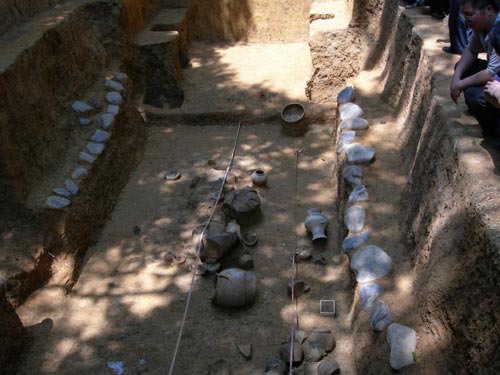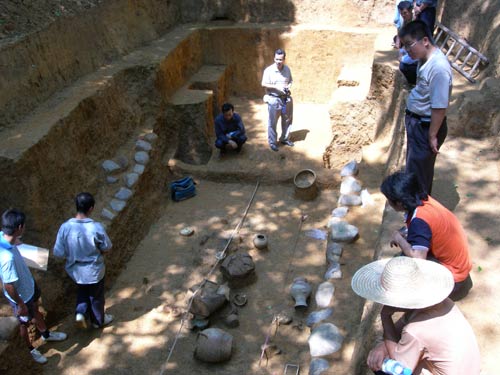 9月1日,从正在发掘的广西桂平大塘城遗址传来消息:该处发现一片汉代古墓群,目前已发掘7座,另外一座正在紧张发掘中。记者立即赶往桂平,在发掘现场看到刚刚出土的大量陶器、青铜器等随葬文物。