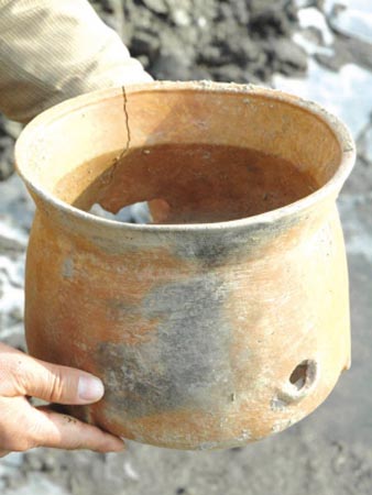 这次将一号沙矿第二区块六百多平方米划成六个探方,挖入二米多深,发现由人工营造的红烧土层、木构遗迹,各类生活用具,和螺蛳壳、蚌壳等生活废弃物。基岩原来是一个小山包,古人依山包在低洼湖域改造环境谋求生存。经初步分析判断,这是古代“原生遗址”,迄今至少有四千年历史。但究竟属商代还是新石器时期,有待考证。