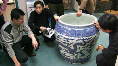 这只大缸近1米高,直径有六七十厘米,缸身有五爪金龙和云纹花饰。据该公司负责人鲁智勇介绍,这是迄今为止我国发现的最大的明代青花瓷缸。景德镇龙珠阁博物馆存有一件类似的宣德大缸,可惜是用残破的瓷片拼成的,而且比即将拍卖的这只小。鲁智勇透露,这只大缸原本保存在景德镇附近某明代王府的老宅中,8年前,一位武汉的收藏家,以极低的价格买下这只大缸。谁知,那位藏家将大缸运回武汉后,却因缸体太大,无法进门,只得存放在郊区农村的一所柴房中。鲁智勇见到这只大缸时,只见柴房不远处就是一处猪圈,大缸蒙着一块白布,放在角落里。