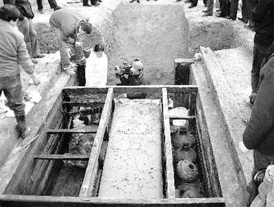 截至昨日下午,在古墓周边已清理出铜鼎、陶器、木俑及祭祀用的木制品等文物共80余件,陶房2间。目前,古墓挖掘工作仍在继续。图为挖掘现场。