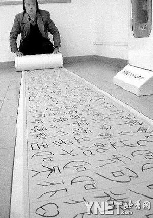 该百米长卷的作者顾冠群教授,被世界艺术联合组织授予“世界艺术名人”称号,他从去年7月份开始耗时半年左右的时间完成了这幅长卷。该长卷书写的内容为《道德经》,总长一百二十余米,写如此多字与长度的甲骨文尚无他人。目前,该长卷已经申报吉尼斯纪录。