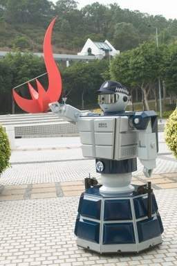 香港居民已经熟悉了戴蓝色制服帽的警察机器人,但是不久前只是美国人研制的警察机器人,现在见到的警察机器人是第三代样机,取名为Robotcop,由香港大学生研制,它在由香港警察局组织的竞赛中胜出。Robotcop会移动、跳舞和展示电视,而且能用中文和英文回答提出的问题,全套红外线传感器帮助机器人确定当地的方位。制作一台这样的警察机器人香港警察局需化费3.8万美元。