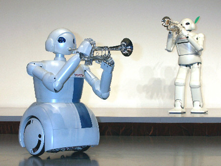 2004年3月11日,日本东京,丰田公司研发出可以步行的高科技机器人。丰田总裁张富士夫(Fujio Cho)出席了新闻发布会。丰田公司表示他们研制机器人的目的是为了开发高智能化机器人,成为人类的助手,协助人们解决工作和生活中的问题。