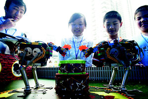 四月二十一日,重庆青少年科技创新大赛上,两只采用蓝牙技术的宠物机器鸡,能自己行走、啄米等。