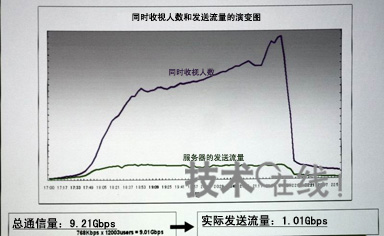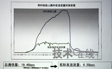 ... 发送流量减至1/5 . ... TV Bank已将此次的BB BROADCAST技术应用于雅虎动画。在2006年9月22日18:30~21:10时间段,采用该技术以168kbit/秒的传输速度实现了对“EXILE”的现场转播,同步收视的观众最多达2万5302人。与普通的单播方式相比,发送流量约减至1/5。具体而言,向2万5302人传输768kbit/秒的影像,总通信量为19.4Gbit/秒,而采用此次的技术,实际通信量可降至4.2Gbit/秒。