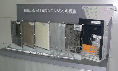 ... 为提高除臭能力,该公司改变了第1层过滤器。此前采用中部电力开发的“Circulash”人工沸石,而此次采用了直径仅为约30μm的微粒子状Circulash,将其粘着固定在过滤器的蜂窝状结构表面上作为过滤器。与使用粒状Circulash的原来产品相比,表面积约可以扩大115倍。另外,第4层过滤器使用的吸附乙醛及甲醛等的活性碳及直径3.5mm的颗粒状Circulash也通过调整数量而提高了除臭能力。