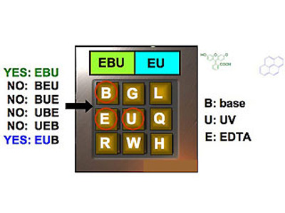 由以色列科学家发明的这种只有分子大小的键盘锁实际上有三个“按钮”,即酸性分子、碱性分子和紫外光。当键盘锁先接触到碱性分子随后是紫外光,会呈现蓝色。当键盘锁被给予另外一种“密码”,酸性分子,碱性分子,最后是紫外光时,它会呈现为绿色。这些反应仅发生在每种成分在三分钟内被混合时,否则键盘锁将自动重置,其他的任何组合对键盘锁几乎不产生影响。