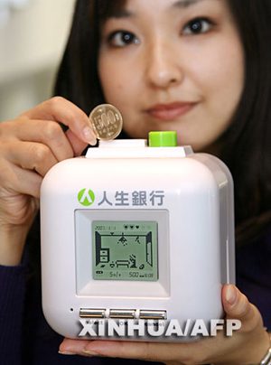 12月29日,日本登美玩具公司一名职员在东京向人们展示该公司推出的带有液晶显示屏的立体存钱罐。这个存钱罐最多能存200枚面值500日圆的硬币。液晶显示屏里的“小人”能根据已经存入的硬币数目展现不同生活的故事。登美玩具公司从12月28日开始在东京销售这种存钱罐,每个售价约合40美元。(新华社/法新)