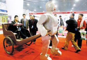 一把铁丝、一堆螺丝、一对电池,被一个农民用螺丝刀、钳子一摆弄就变成了一个会走路的机器人,虽然简陋但也别有一番可爱……昨日,第三届中国(广州)国际机械装备制造业博览会在琶洲会展中心举行,来自北京通州的农民吴玉禄的机器人吸引了全场不少观众和参展商的注意,这些看起来有点简陋的机器人会走路、会拉黄包车,这名农民机器人发明家告诉记者,他希望找到人投资他的技术,把他的这些技术推广到公园里。