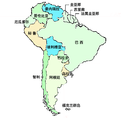 【概 况】名称:南亚美利加洲,简称南美洲。位置:位于西半球的南部,东濒大西洋,西临太平洋,北滨加勒比海,南隔德雷克海峡与南极洲相望。一般以巴拿马运河为界同北美洲相分。范围:大陆东至布朗库角(西经34°46′,南纬7°09′),南至弗罗厄德角(西经71°18′,南纬53°54′),西至帕里尼亚斯角(西经81°20′,南纬4°41′),北至加伊纳斯角(西经71°40′,北纬12°28′)。