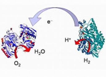 以酶为基础的第一个氢燃料电池样品目前虽然只能输出0.7伏电压和微小电流——足以使电子表行走,但是却能确保各种袖珍电子装置的用电。在普通燃料电池中氧气(来自空气)和氢气从交换膜片两面通过,膜片分开带有电极的小室,膜片能自由通过质子。在一个电极上氢气被分解成质子和电子,电子不能通过膜片,在外电路接通时只能抵达燃料电池对面的小室,在那里参与通过膜片的氧气与质子的水合成。镀在电极表面上的催化剂保持燃料电池中发生的两种反应,通常使用铂,铂催化剂和交换膜片是燃料电池最昂贵的组分,这也是它们难以推广应用的一个原因。