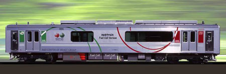 这是4月12日东日本铁路公司公布的世界第一节以燃料电池为主要动力源的列车示意图。该公司11日宣布,世界首节燃料电池列车预计于2006年7月问世。这节列车是试验用车,设计最高时速为100公里。列车车身下部安装有氢储存箱和两组燃料电池,燃料电池通过使氢和氧发生反应产生电力驱动列车。东日本铁路公司计划在确认燃料电池列车的安全性后,于2007年4月后将这种列车投入试运行。