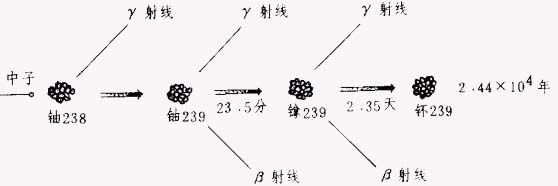 研究发现,铀-238吸收中子后,经过经几次核蜕变,可以变成另一种自然界不存在的易裂变物质——钚-239(见图4)。