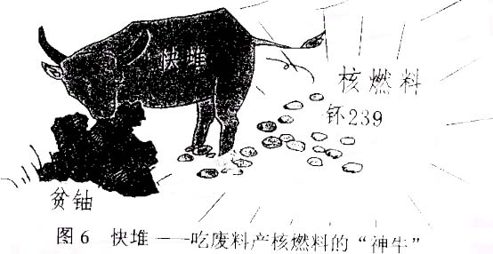 如果只发展热堆电站,占天然铀98%以上的铀资源只能被作为核废料(即贫铀)而弃置;还将危害自然环境。在发展热堆的同时发展快堆,就可以像图6形象地表达的那样:变废为宝,即把贫铀转变为新的核燃料。所以,快堆电站必将成为核电的新一代。