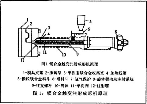 (Thixomolding):触变注射成型的工艺过程接近于注塑成型,其装备原理如图1所示。首先将镁合金锭加工切制成细颗粒状,将此镁合金颗粒装入料斗中,强制输送到粒筒中,粒筒中旋转的螺杆驱使镁合金颗粒向模具方向运动,当其到达粒筒的加热部位时,合金颗粒呈部分熔融状态,在螺旋体的剪切作用下,具有枝晶组织的合金料形成了具有触变结构的半固态合金,当其累积到一定体积时,被高速(5.5m/s)注射到抽成真空的预热型腔中成形。半固态合金在外力作用下可以象热塑性塑料一样流动成形,但触变注射成形的温度,压力以及螺杆旋转速度远远高于注塑设备的。成形的加热系统采用了电阻和感应加热的复合工艺,将合金加热至582±2℃,固相体积分数达60%,同时通入氩气进行保护。