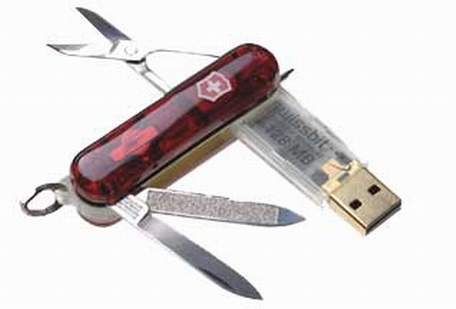 Swissbit公司在德国汉诺威举办的CeBIT 2004展览会上初次展出独特的美国Victorinox小刀,它除了能切东西、拔瓶塞、开罐头等基本功能外,还能作存储器用。这种新型瑞士军刀内装64MB和128MB存储器--USB闪存,它可以像普通刀刃一样折叠,通过USB2.0端口可以直接实现与计算机连接,不需要任何附加接线。目前64MB新型瑞士军刀售价为55欧元,128MB售价暂时没有确定。