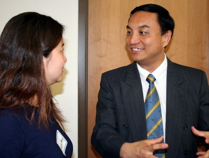 上图为魏博士(右)在报告会后与听众交流。