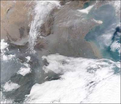美国宇航局两颗人造卫星最近拍摄到的照片显示,工业活动造成的烟雾和尘埃覆盖在中国东部低洼地区