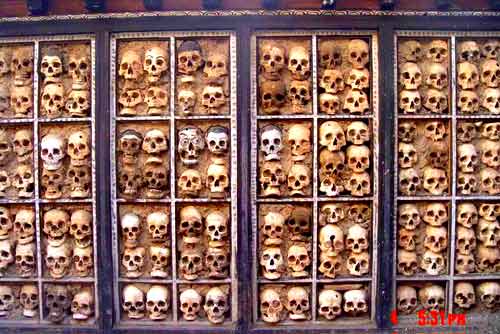 在西藏,人死后尸体全部喂鹰鹫,不留一点,唯独藏北的比如县达摩寺内的多多卡*台,保留了众多死者的头骨,此举堪称世界一绝。子文在他的《苍茫西藏》中写道:原先达木(实为一地。由于是音译,各作者所用汉字也不同)*台三面是骷髅墙,有一人多高,后来在一个大雨如注的日子,浊水从山上滚滚而下,*台的墙倒了。现在的两面骷髅墙,是用剩下的骷髅在近几十年内慢慢垒砌而成的。现在剩下的这两堵墙只有原来的一半高。