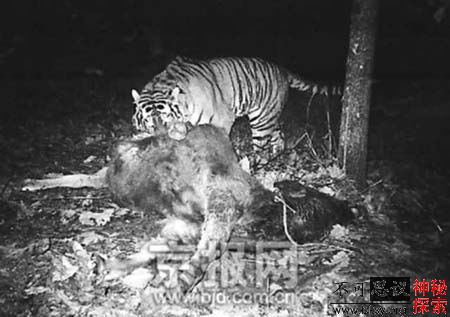 吃牛的那头野生东北虎被拍到了!去年12月30日晚上,吉林珲春东北虎国家级自然保护区管理局工作人员在那头母牛的尸体附近架设了远红外线照相机,拍摄到了野生东北虎活动的照片,照片上的这头东北虎将白天被它咬死并吃掉了半拉屁股的牛再次撕扯、吞噬。这是该保护区成立以来第三次拍到野生东北虎活动的照片。